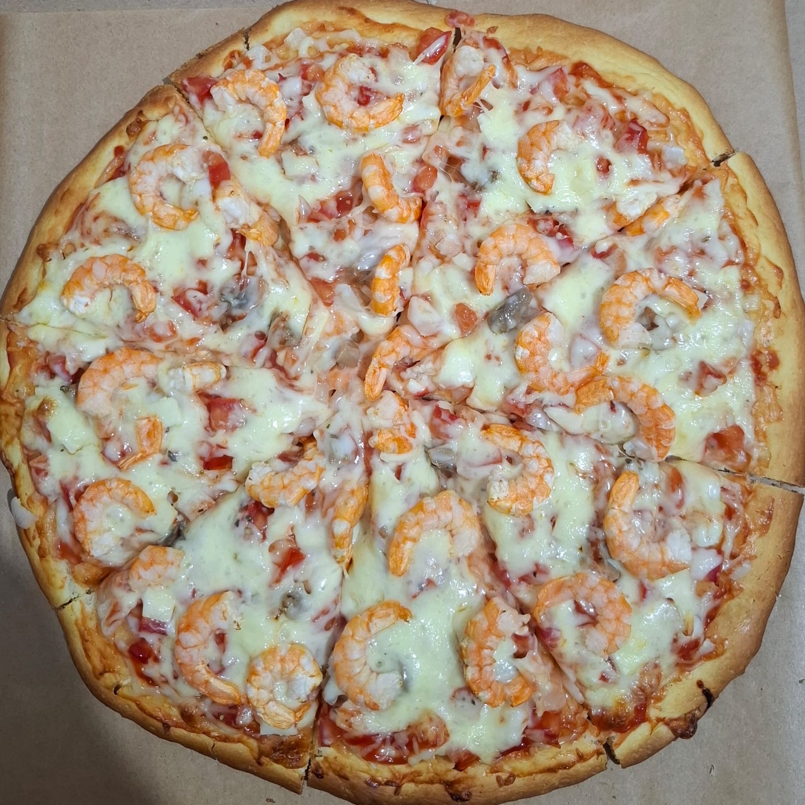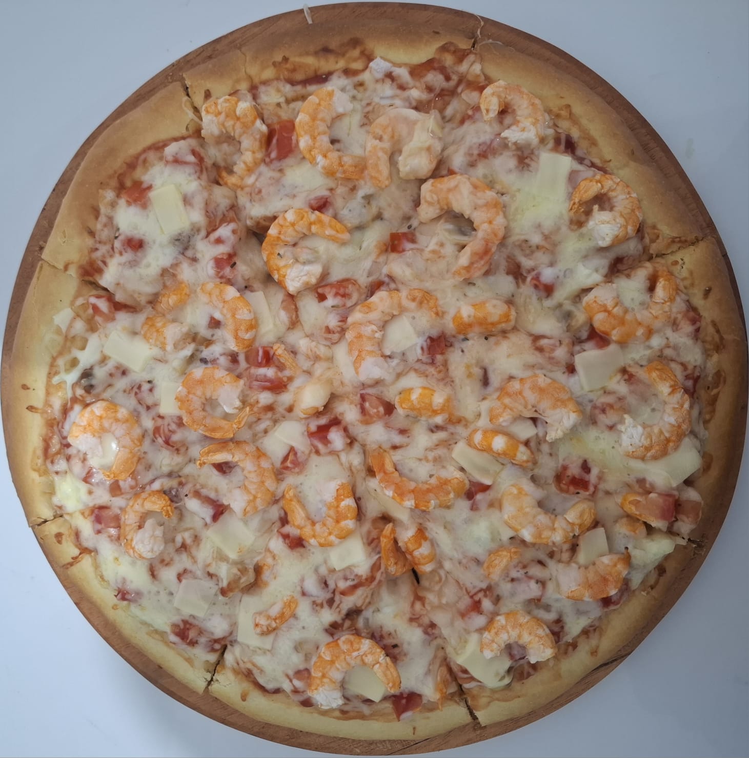 Pizza dengan topping udang pilihan dan berbahan premium.